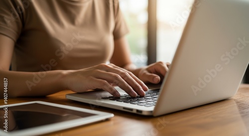 © AlfaSmart, Naklejka premium Focused professional typing on laptop with tablet on desk in modern workspace