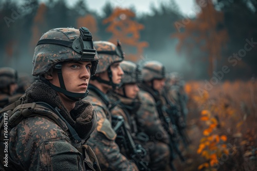 © Viktoriia, Fototapeta premium Focused Soldier in Camouflage Gear Amongst Tactical Unit in Autumn Forest
