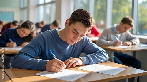 Fototapeta premium Focused student diligently writing during important exam in bright, modern classroom setting
