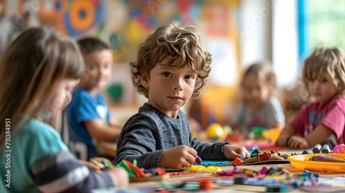 Fototapeta premium Focused Toddler During Playtime in Preschool