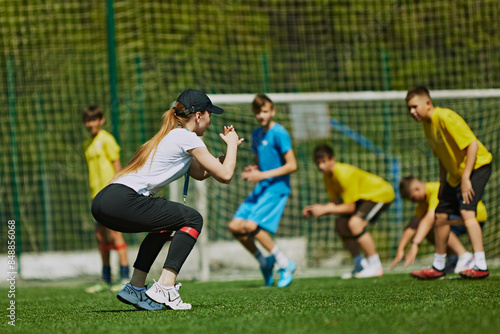 Naklejka premium Focused Training. Group of boys, children training soccer with female coach, doing squats with elastic bands. Outdoor stadium. Concept of sport, school, childhood, hobby, active lifestyle