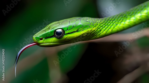 © afrah, Obraz premium Focused view of vine snake in strike pose with tongue out, soft jungle background blur and scale precision