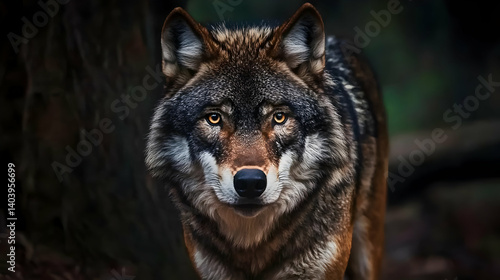 © Sujito, Fototapeta premium Focused Wolf Portrait In Dark Forest