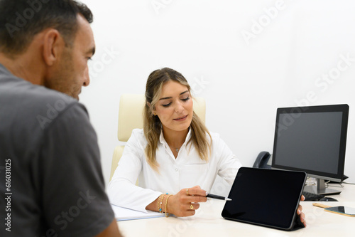 © Franci Leoncio, Fototapeta premium Focused woman showing tablet screen and explaining