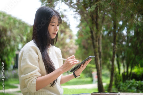 © wattana, Obraz premium Focused woman sketching on digital tablet with stylus in lush outdoor environment.