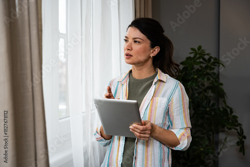 © Srdjan, Fototapeta premium Focused woman standing by window review important digital notes on her tablet organizing task planning personal goals learning new skills managing her everyday responsibilities with calm concentration