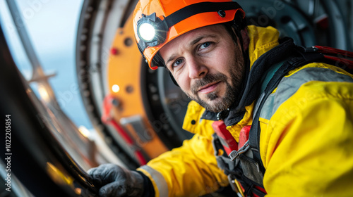 © kongkiat chairat, Obraz premium focused worker in bright yellow waterproof jacket and helmet, equipped with headlamp, prepares for task in marine environment, showcasing determination and professionalism