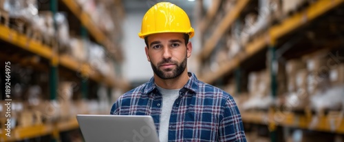 © ckybe, Naklejka premium Focused worker in warehouse with shelves deeply engaged using a laptop feeling determined.