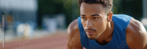 © Iryna, Fototapeta premium Focused young african male athlete in blue tank top ready for sprint race