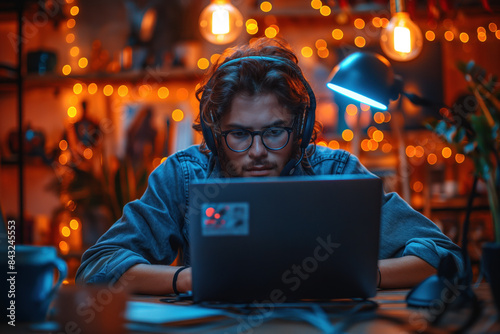 © Vadym Hunko, Obraz premium Focused young man with glasses and headphones working on a laptop in a cozy, dimly lit room with string lights, creating an intimate and studious atmosphere.