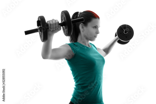 © Mendelex, Obraz premium Focused young woman exercising with dumbbells