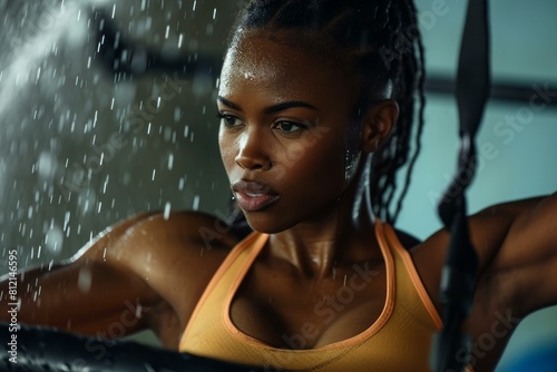 Obraz premium Focused young woman exercising with sweat glistening on her skin under...