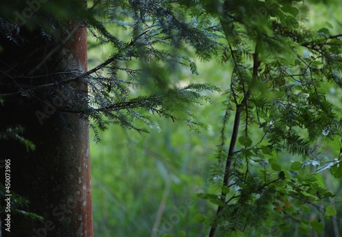© Anna, Naklejka premium Foerest natural background with tree trunk fir branches and greens.