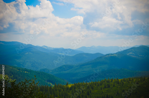 Fototapeta premium Fog and cloud mountain valley landscape, Ukraine