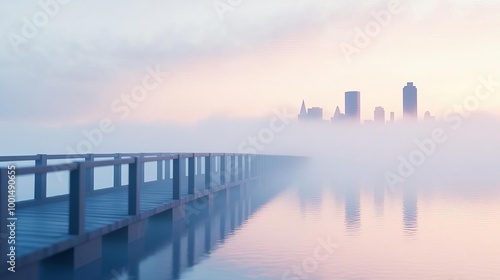 © Design@22, Naklejka premium Fog-covered bridge, city skyline backdrop, mysterious view, 3D illustration