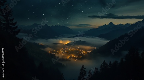 Fototapeta premium 22.Fog-covered mountains under a dusky autumn sky in the Dolomites, with stars beginning to shimmer above; scattered city lights below add warmth to the shadowed valley, surrounded by dense forest