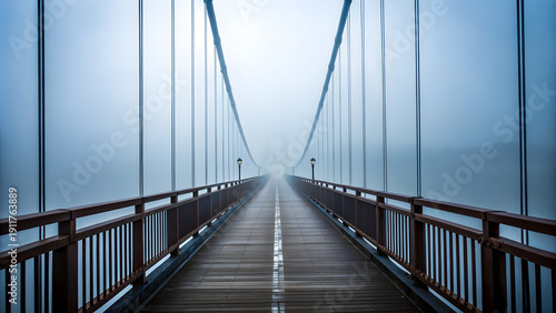 © Azlam, Obraz premium Fog Covered Suspension Bridge Low Angle Perspective