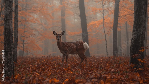 Fototapeta premium Fog-covered woodland with a deer in autumn