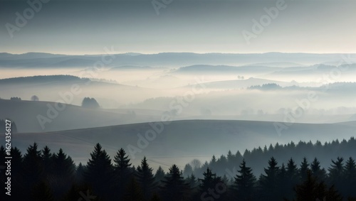 © Sergii, Fototapeta premium Fog covering rolling hills and pine forest at dawn