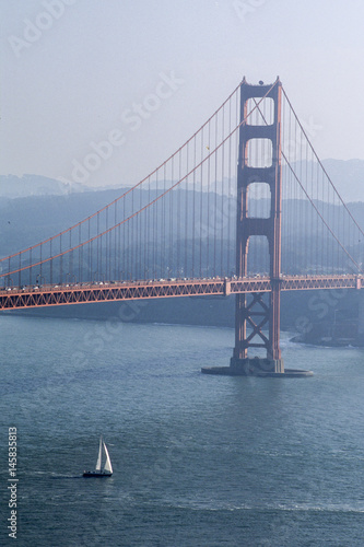 © David J. Shuler, Fototapeta premium Fog covers top of one of the Golden Gate Bridge