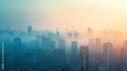 © anang, Fototapeta premium Fog covers urban buildings creating a mysterious atmosphere.