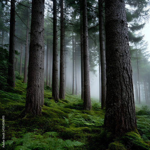 Fototapeta premium Fog entering coniferous forest on mossy hillside