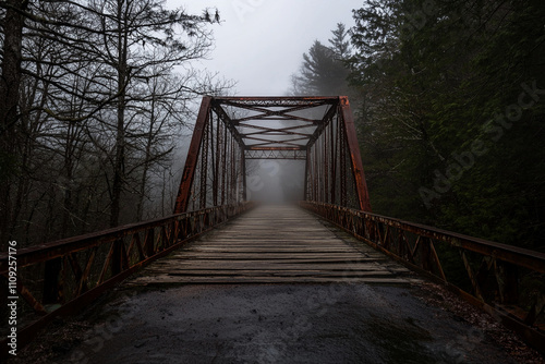 © pavlofox, Obraz premium Fog envelops abandoned bridge in tranquil forest setting