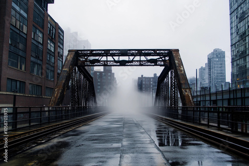 © plysuikvv, Obraz premium Fog envelops the old train bridge in a cityscape at dawn