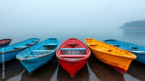 © Daniel, Naklejka premium Fog hovering over small fishing boats docked near a village shore