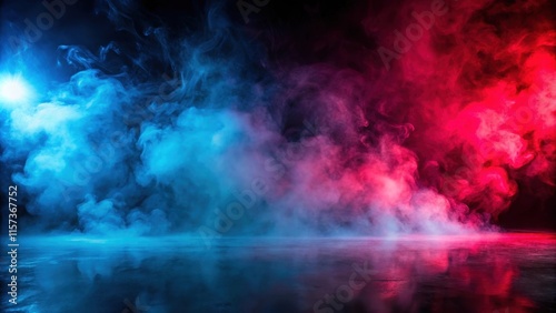 © lapeepon, Fototapeta premium Fog in red blue neon light on black background , mist, atmospheric, eerie, ethereal, surreal, abstract, moody