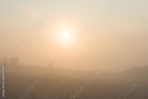 Obraz premium Fog in the autumn morning, the sun at dawn, natural natural background.