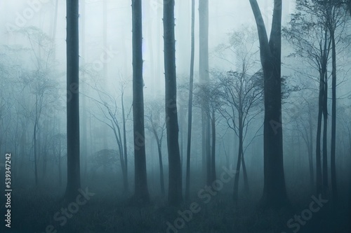 © The 2R Artificiality, Obraz premium Fog in the forest. Dark forest. Trees silhouette. Rain forest. Rain season