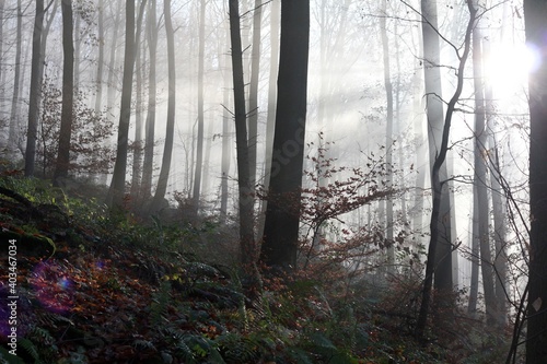 © TATIANA, Obraz premium Fog in the forest. Sunrays in the forest. Fog in the wood.