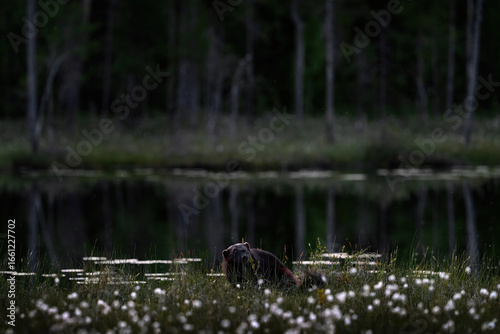 © ondrejprosicky, Fototapeta premium Fog morning with wolverine. Finland wildlife. Wolverine in summer forest lake habitat. Animal running in fall golden grass. Wolverine behaviour in habitat, taiga. Wildlife nature. June nature.