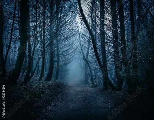Naklejka premium Fog on an alley in the dark forest