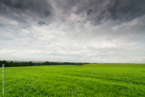 © Georgii Shipin, Fototapeta premium Fog on forest hilly meadows in a rainy morning