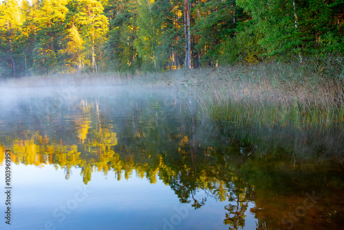 © Aivis, Obraz premium fog on the lake on a sunny autumn morning