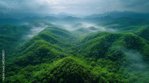 Fototapeta premium Fog over mountains covered with impenetrable green forests, view from above