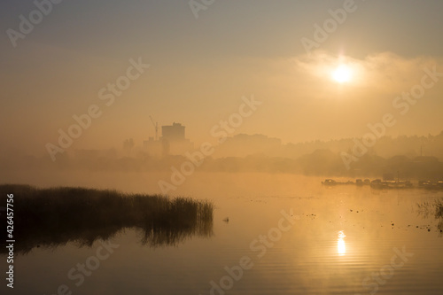 © Alex, Fototapeta premium Fog over the river and city. Misty morning in the river. Foggy sunrise over the lake