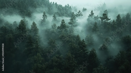 Fototapeta premium Fog rolling over a dense forest in the early morning