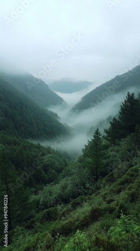 Obraz premium Fog rolling through a mountain pass, foggy weather, mysterious and silent