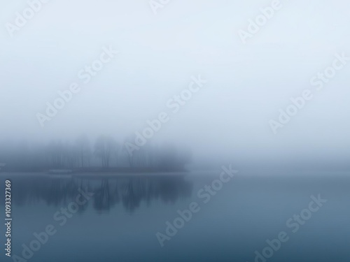 Fototapeta premium Fog rolls in over a quiet lake with trees reflected in the calm water,...