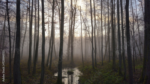 © vytautas, Naklejka premium Fog settles over a tranquil forest stream during early morning light in autumn