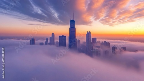 Obraz premium Fog Shrouded Cityscape at Sunrise with Towering Buildings in Melbourne Australia