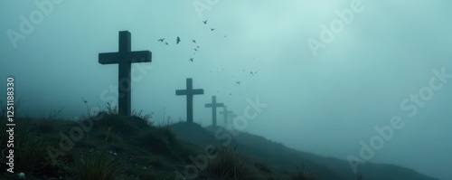 Naklejka premium Fog-shrouded crosses, black crows fly overhead , crosses, fantasy