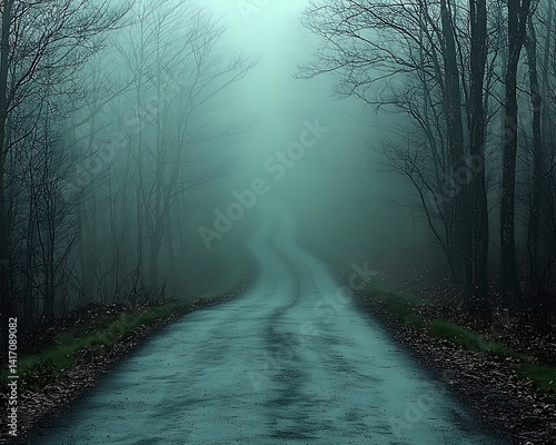 Naklejka premium Fog-shrouded, winding road through a misty forest.