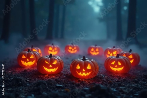 © Phetthanousack, Naklejka premium Fog surrounds a circle of softly lit jack o lanterns, glowing,, fog
