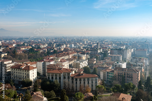 Fototapeta premium Foggy aerial view on Bergamo town, Lombardy, Italy