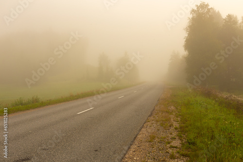 Fototapeta premium foggy and cool morning on the highway, in the field during summer