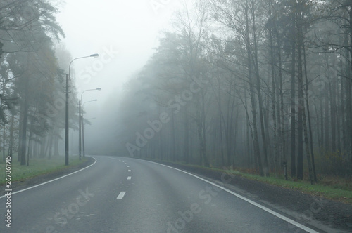 © Maxim Kukurund, Fototapeta premium foggy autumn empty road